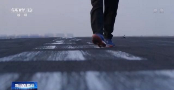 總臺央視記者李寧:這個就是在陸地上來模擬航母艦載機著陸的平臺。我們在這個地方呆了兩天,直到今天日落黃昏,才終于有機會走上這個平臺。因為它艦載機訓練的頻次非常頻繁,我們只有在訓練的間歇,才有機會帶大家來看一下。這里都是黑黢黢的一片,所以這個地方就叫做黑區。這一道道胎印就見證著這支艦載機部隊從無到有,一步步成長的過程。