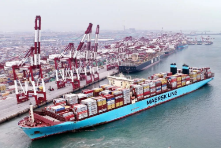 ▲在山(shan)東港(gang)口(kou)青島(dao)港(gang)前(qian)灣碼頭,歐洲貿易航線的(de)“美途(tu)馬士基”集(ji)裝箱貨輪解纜起航(2022年7月29日攝,無人機照片)。新(xin)華(hua)社記者 李紫恒 攝