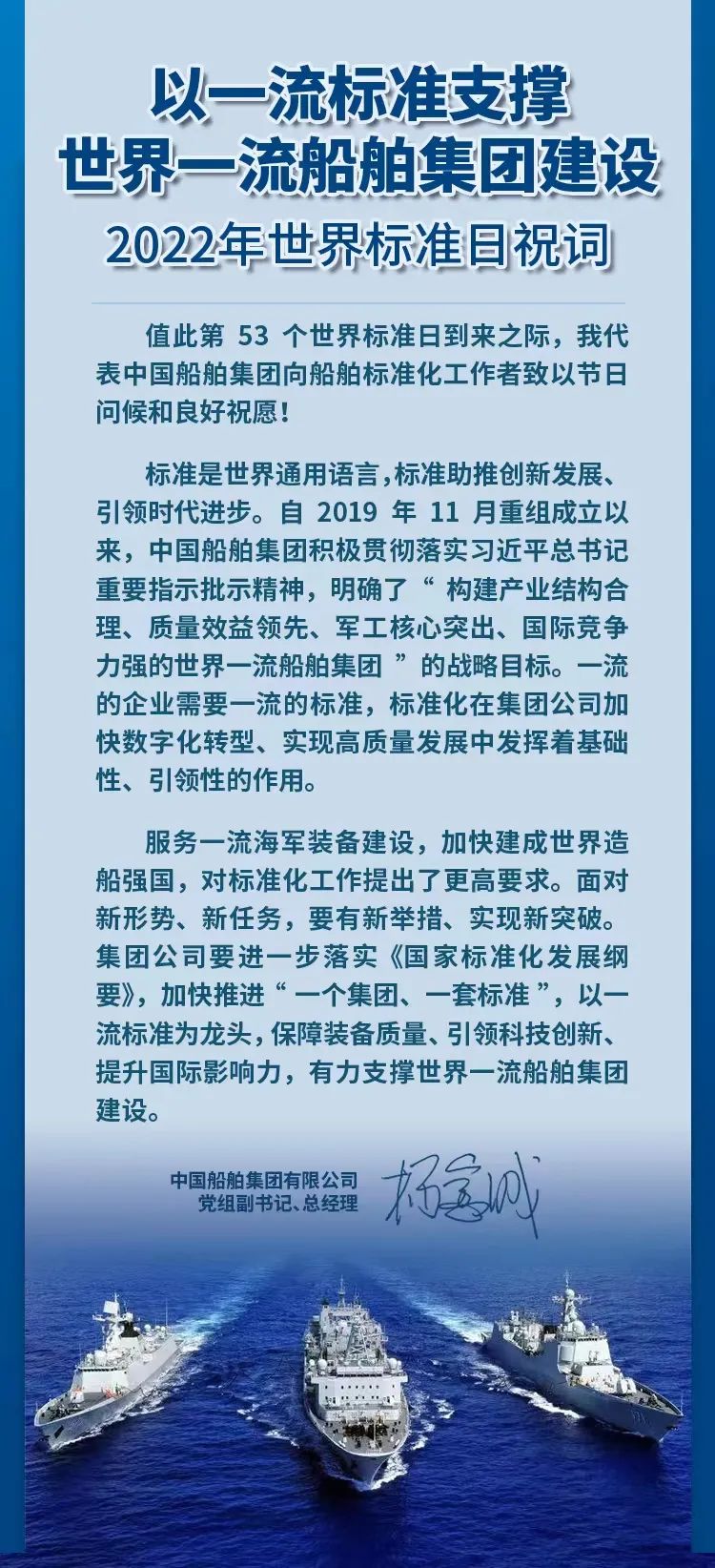 中(zhong)國(guo)船(chuan)舶(bo)集(ji)團(tuan)有限(xian)公司黨組副書記、總經(jing)理楊(yang)金成致祝詞,強(qiang)調集(ji)團(tuan)公司要(yao)進(jin)一步落實(shi)《國(guo)家標(biao)準化發展綱要(yao)》,加快推進(jin)“一個集(ji)團(tuan)、一套標(biao)準”,以一流標(biao)準為龍(long)頭,保障裝備質量、引領科技創新、提升國(guo)際影(ying)響力,有力支撐世界一流船(chuan)舶(bo)集(ji)團(tuan)建設,以優異的成績迎接黨的二十大勝利召開(kai)。