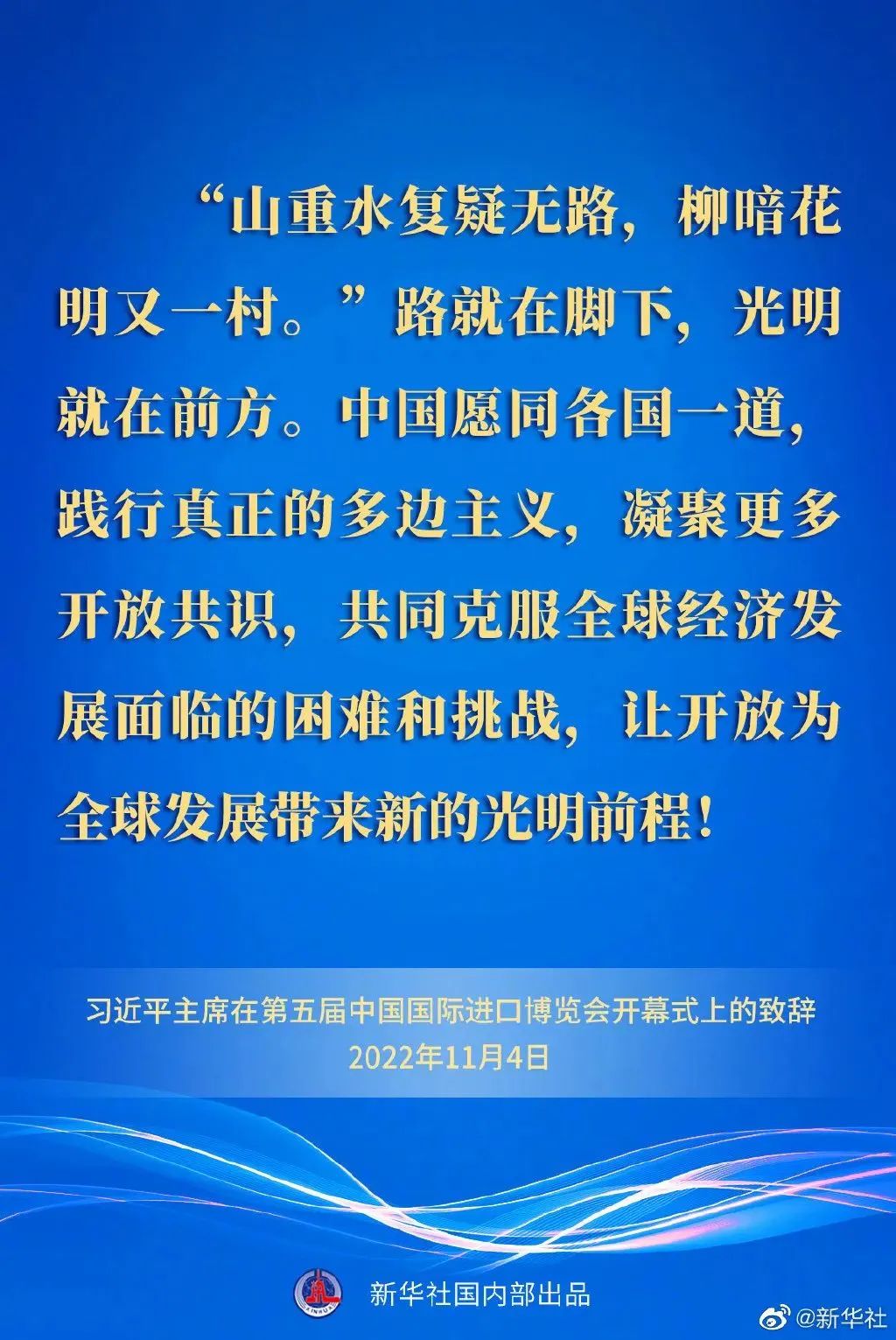 習近平最(zui)后強調,路就在腳下(xia),光明(ming)就在前方。中國愿同各國一道(dao),踐行真正的多(duo)邊主義,凝聚更多(duo)開放共識,共同克服全(quan)球(qiu)經濟發(fa)展(zhan)面臨的困難(nan)和挑戰(zhan),讓(rang)開放為全(quan)球(qiu)發(fa)展(zhan)帶來新的光明(ming)前程!