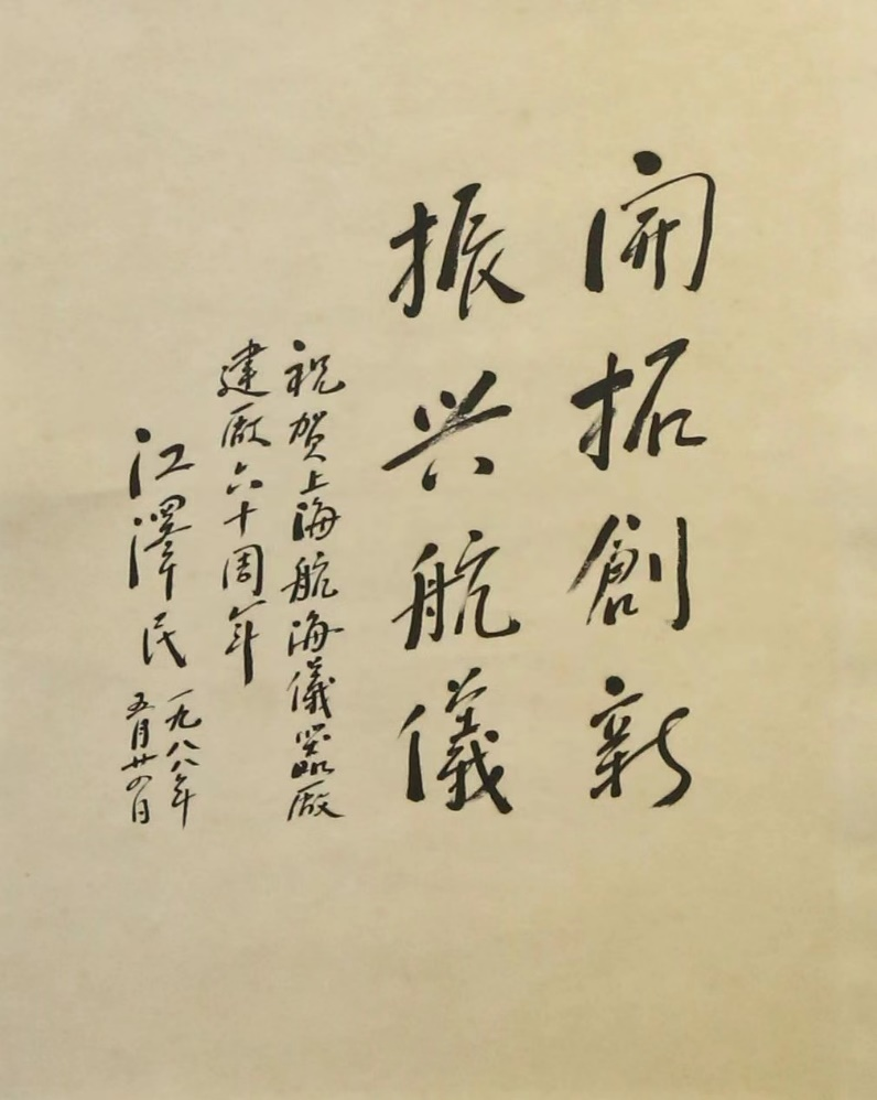 江(jiang)澤民同(tong)志曾給系統工程研究院、中船(chuan)電科旗下中船(chuan)航海題(ti)詞。1988年5月,為慶(qing)祝(zhu)上海航海儀(yi)器廠建廠60周(zhou)年,江(jiang)澤民同(tong)志寫下“開拓(tuo)創新(xin),振興航儀(yi)”以示祝(zhu)賀。