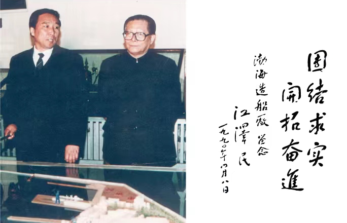 1990 年4月8日,江(jiang)澤民同志視察(cha)渤海造船廠并題詞“團結求實,開拓奮進”。