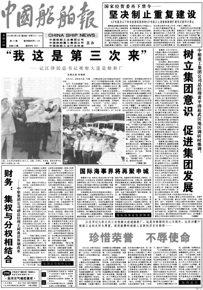 1999年8月20日,《中國船(chuan)(chuan)舶報》報道江澤民同志第三(san)次視察大船(chuan)(chuan)集團。