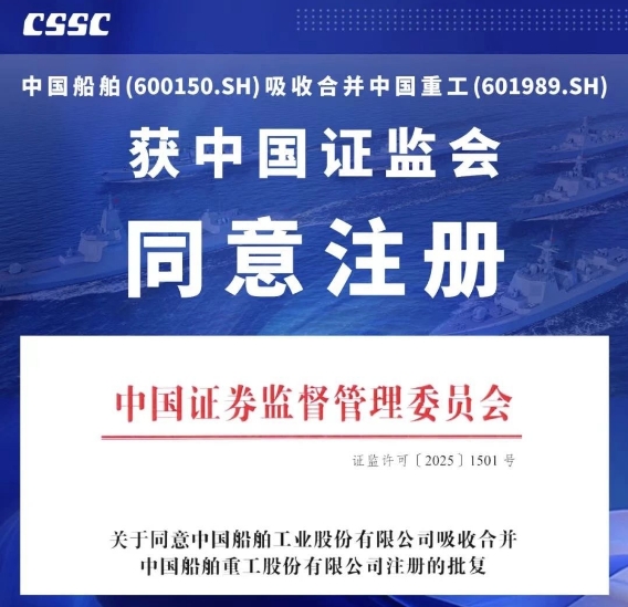 7月(yue)18日,中(zhong)國(guo)證監會發(fa)布《關于同意(yi)中(zhong)國(guo)船(chuan)舶工(gong)(gong)(gong)業(ye)股(gu)(gu)份有(you)限(xian)公司(si)(si)(si)吸(xi)收合并中(zhong)國(guo)船(chuan)舶重(zhong)工(gong)(gong)(gong)股(gu)(gu)份有(you)限(xian)公司(si)(si)(si)注(zhu)冊的批復(fu)》,同意(yi)中(zhong)國(guo)船(chuan)舶工(gong)(gong)(gong)業(ye)股(gu)(gu)份有(you)限(xian)公司(si)(si)(si)換股(gu)(gu)吸(xi)收合并中(zhong)國(guo)船(chuan)舶重(zhong)工(gong)(gong)(gong)股(gu)(gu)份有(you)限(xian)公司(si)(si)(si)。
