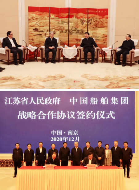 12月21日,中國船舶集團有限公司與江蘇省人民政府在南京簽署戰略合作協議。中國船舶集團黨組書記、董事長雷凡培,黨組副書記、總經理楊金成,黨組成員、副總經理錢建平、杜剛,江蘇省委書記、省人大常委會主任婁勤儉,省委副書記、省長吳政隆,省委常委、省委秘書長郭元強,副省長馬秋林,省政府秘書長陳建剛等領導出席簽約儀式。楊金成、馬秋林分別代表雙方在協議上簽字。簽約前,雙方圍繞共同服務國家戰略,就進一步加強交流合作、實現共同發展進行深入交流并達成共識。