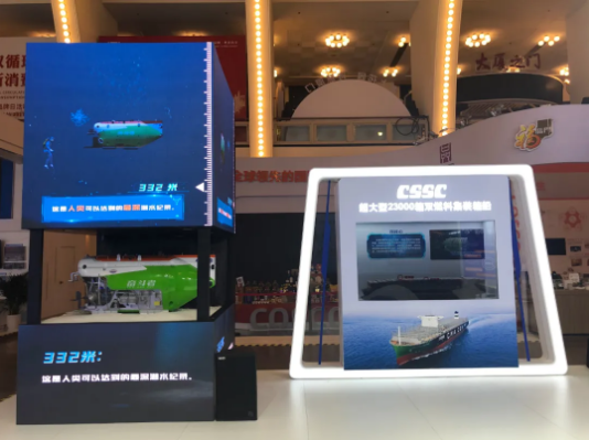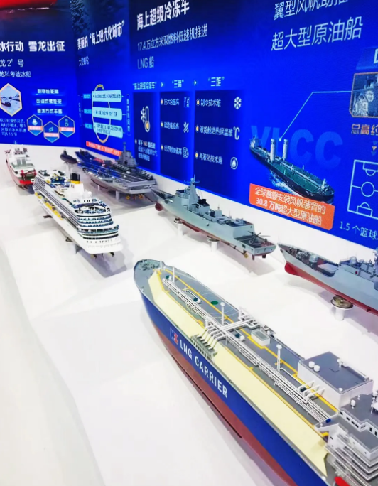 進入中國船(chuan)舶展廳,觀眾不僅能夠看到“奮斗者”號全海深載(zai)人潛(qian)水器、“雪龍2”號極地科考船(chuan)等多個高科技(ji)品牌(pai)產品,還(huan)可以通過(guo)航空母艦(jian)、常規動(dong)力潛(qian)艇、驅(qu)逐(zhu)艦(jian)、護衛(wei)艦(jian)模型了解(jie)我國國防裝備(bei)實力。