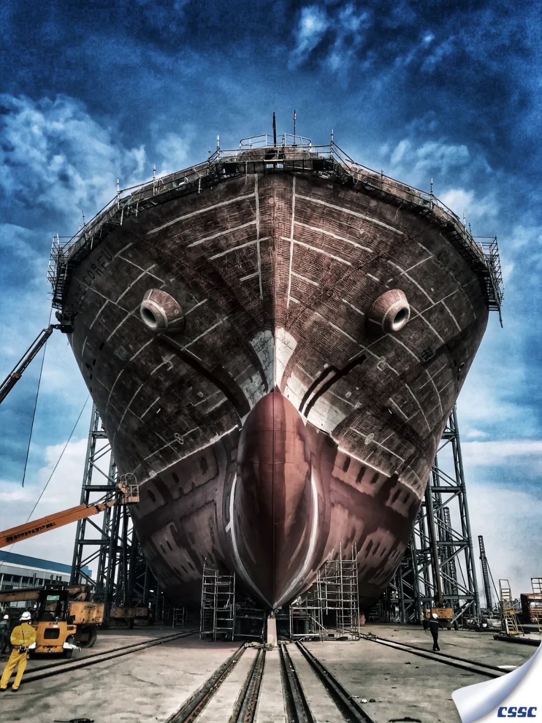 該片拍攝于中船澄西金山塢內MARITIME VANESSA (HONGKONG) 船進塢油漆涂裝和螺旋槳修理作業時,創作主要利用船舶與現場作業人物大小形成超大反差,以獨特的視角展現了涂裝后新船的雄偉和迷人色彩。