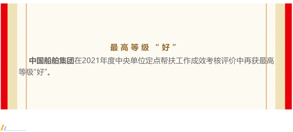 近日(ri),中(zhong)國船舶(bo)集團在(zai)2021年度中(zhong)央單位定點幫(bang)扶工作成效考核評價中(zhong)再獲(huo)最高等級“好(hao)”。這是自2019年組建成立以(yi)來,中(zhong)國船舶(bo)集團連續(xu)第三年獲(huo)“好(hao)”。