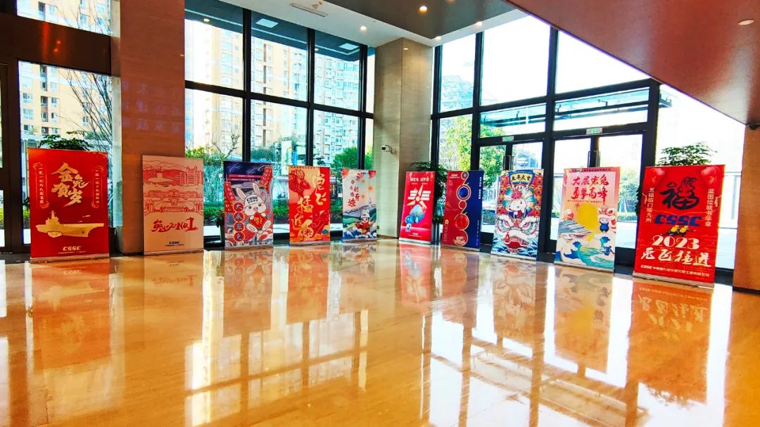 海報主體部分以國內首臺深遠海浮式風電裝備“扶搖號”為創意點,通過含有“大風車”形象的寫意“春”字,表達中船海裝將在春風浩蕩中大展宏“兔”,在向海圖強征程中矢志奮斗!
