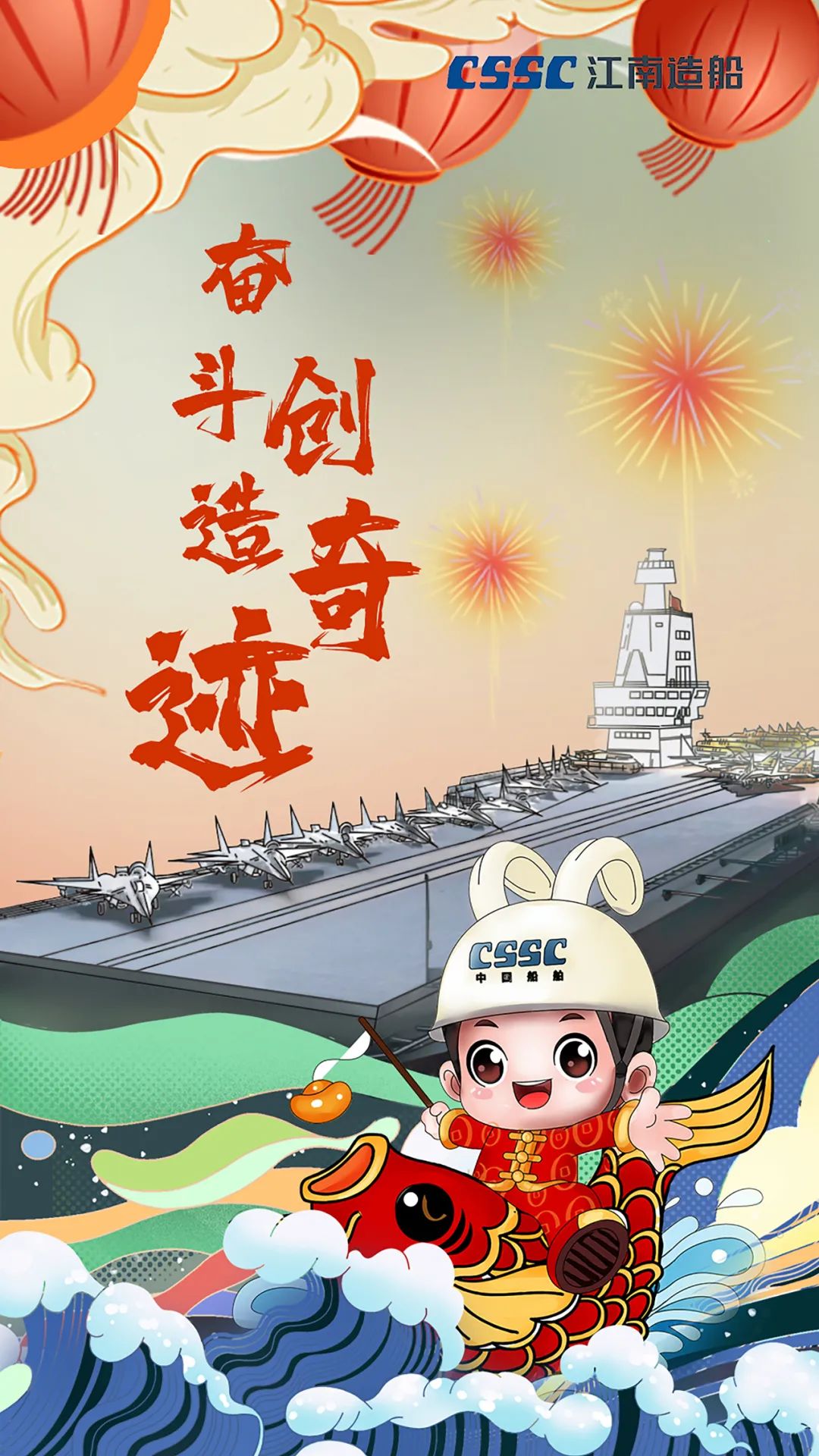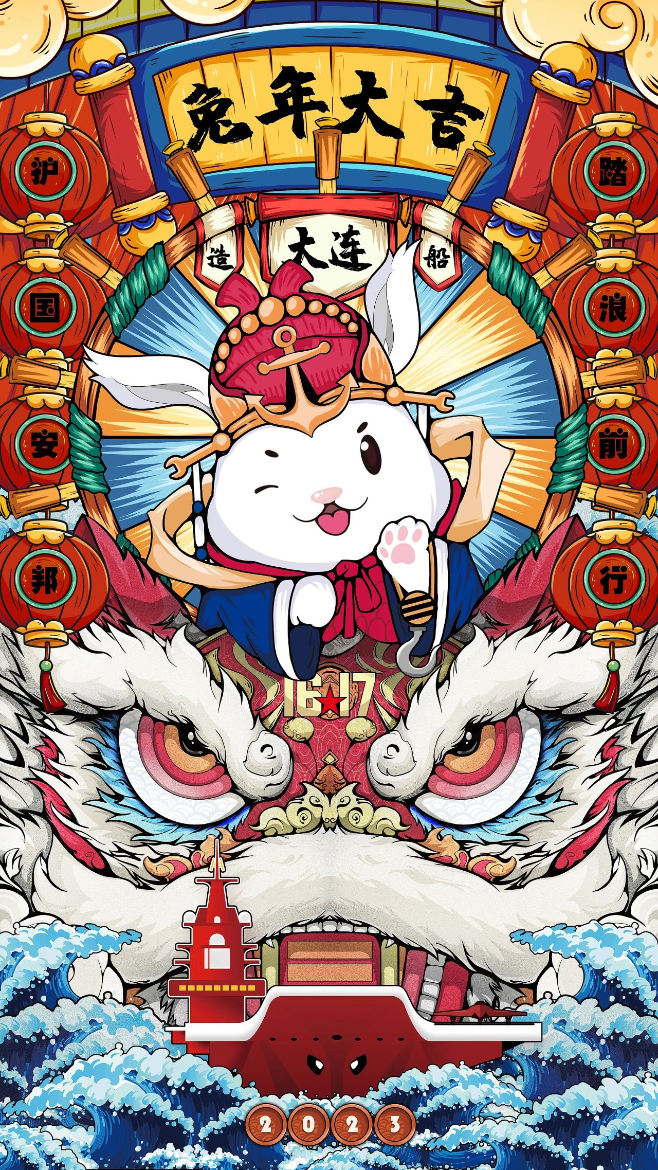 海(hai)報中(zhong)所展(zhan)現的(de)元(yuan)素(su),皆(jie)由大(da)連造船(chuan)元(yuan)素(su)組成,中(zhong)間癸(gui)卯兔(tu)的(de)頭冠裝飾以船(chuan)錨、舵軸(zhou)為(wei)主,下方(fang)航(hang)母在海(hai)中(zhong)追風逐浪(lang),象征大(da)連造船(chuan)必將在新時代發展(zhan)中(zhong)踏浪(lang)前行。
