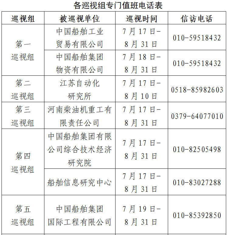 根據中國船舶集團黨組2023年第一輪巡視工作部署,截至2023年7月17日,巡視工作已經鋪開。其中,對中國船舶工業貿易有限公司、中國船舶集團物資有限公司、江蘇自動化研究所、河南柴油機重工有限責任公司、中國船舶集團有限公司綜合技術經濟研究院、船舶信息研究中心、中國船舶集團國際工程有限公司等7家單位開展常規巡視,對中船上海船舶工業有限公司、廣州船舶工業有限公司等2家單位開展專項巡視,對武漢數字工程研究所、武漢船用電力推進裝置研究所、武漢重工鑄鍛有限責任公司、中國船舶集團長江科技有限公司、中船重工衡遠科技有限公司等5家單位開展巡視“回頭看”。