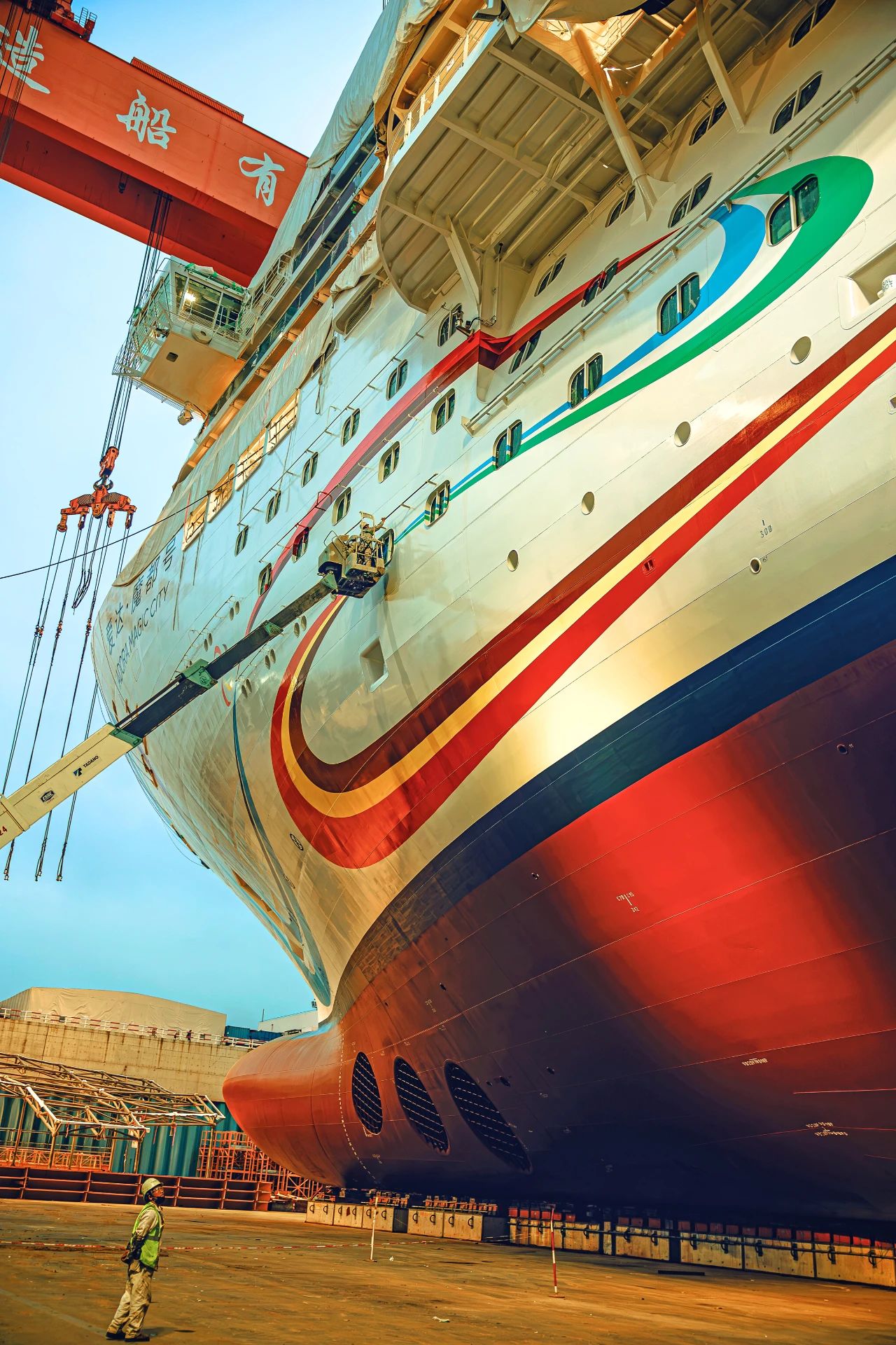 照片攝于國產首艘大型郵輪首次出塢前夕,拍攝時期為傍晚,船塢開啟燈光照明,工人在對船身做最后的涂裝修飾工作。這樣的角度觀看國產首艘大型郵輪令人無比震撼。