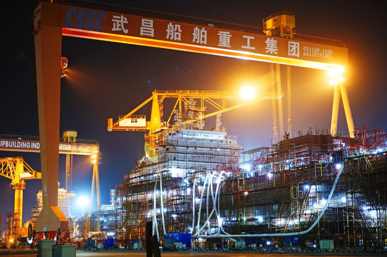在武漢船機平臺總裝現場,華夏金租神大平臺配套的1200噸起重機正在安裝,大件吊裝各項準備工作繁瑣,一切就緒時,天已經黑了,現場一鼓作氣開始吊裝對接,展現了船舶人只爭朝夕、不負韶華、忘我工作精神風貌。