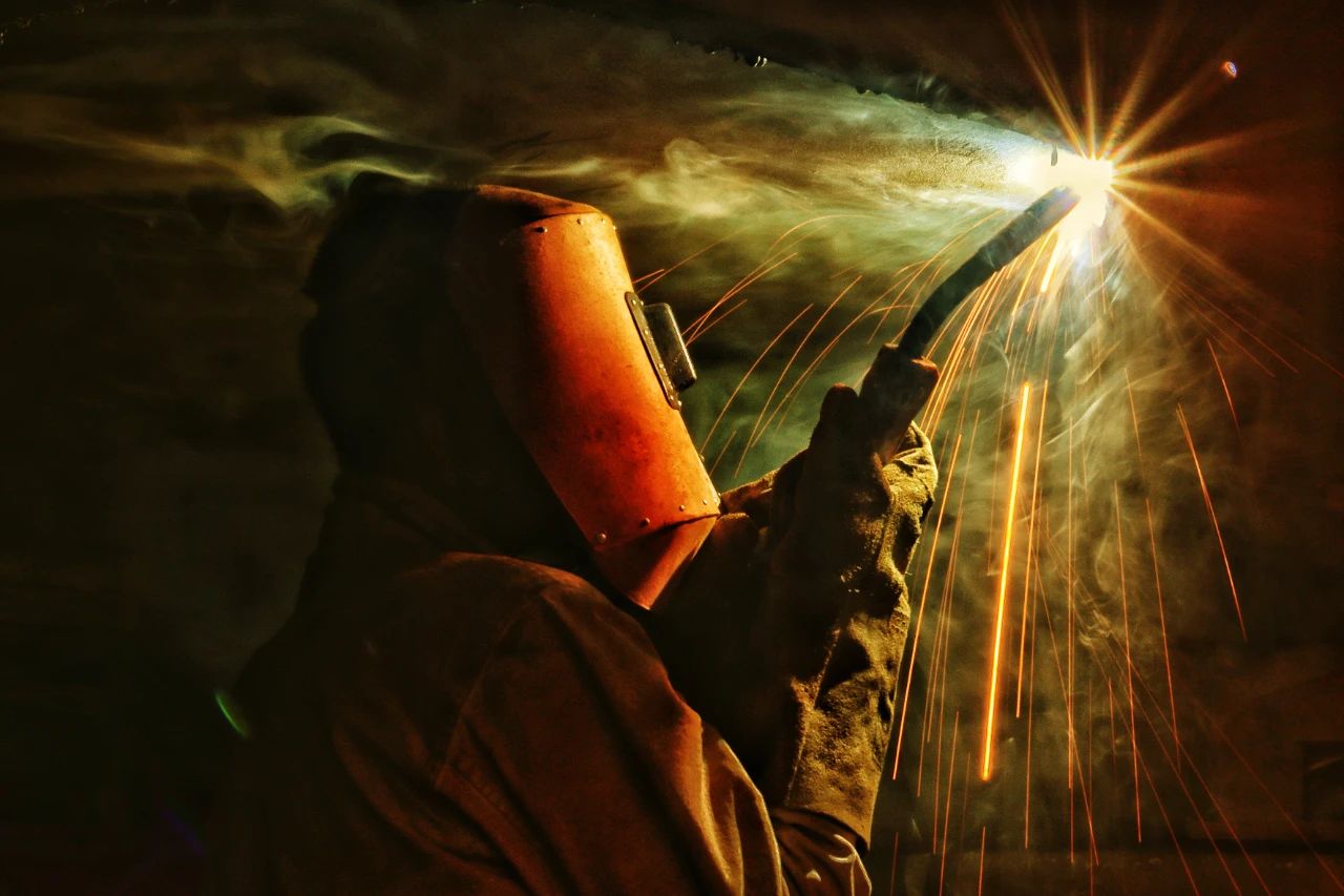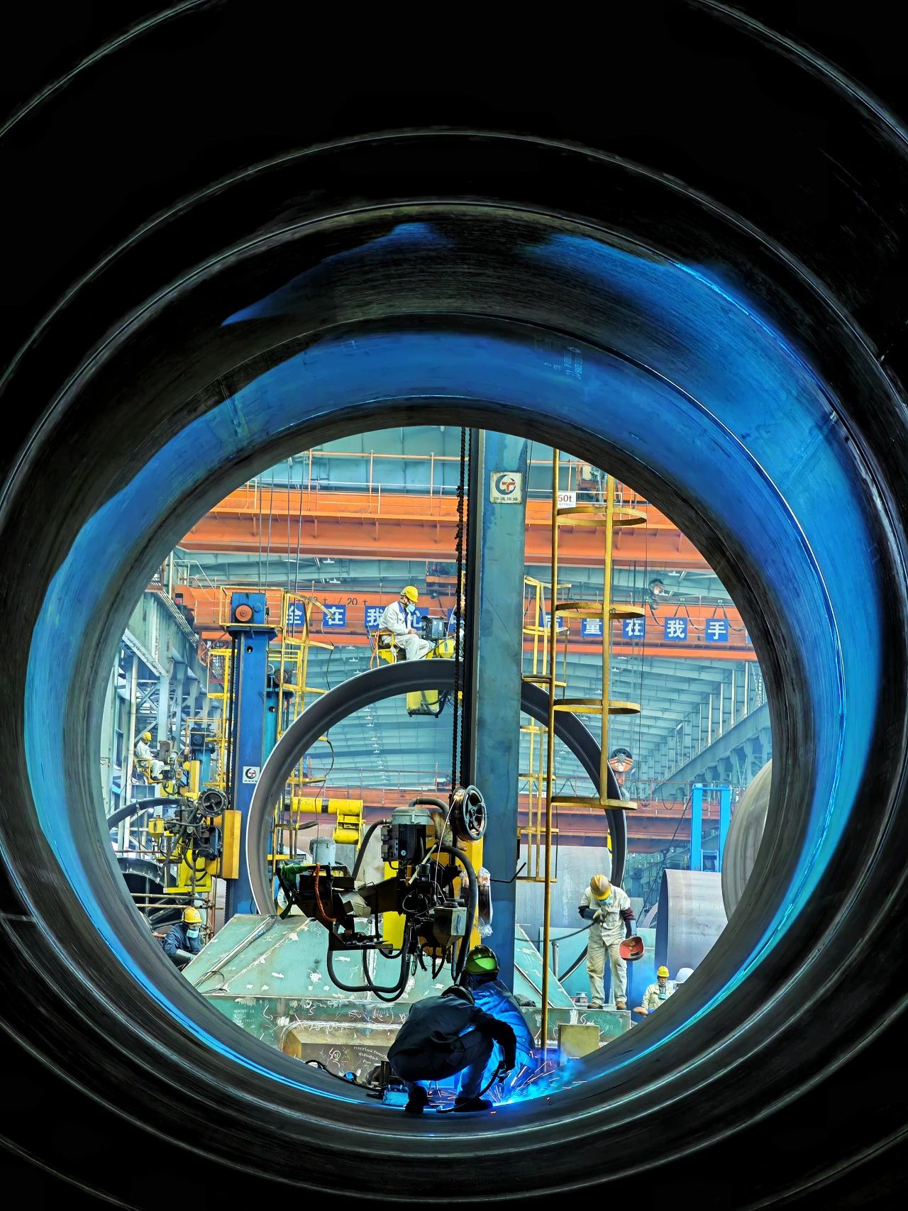 一位“全副武裝”正在進行焊接作業的焊工,焊花飛舞在狹小的工間里,折射出如彩云般的景象,猶如巨人正在“補天”。