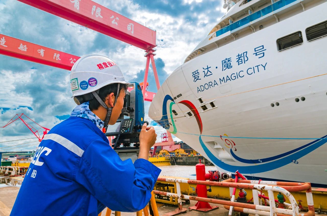 精度技術部的員工正在監測國產首艘大型郵輪試航歸來時的精準坐墩數據。