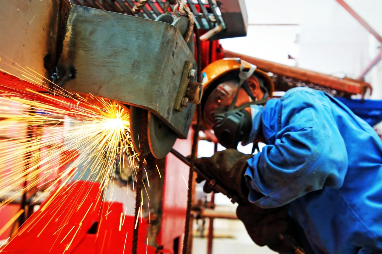 電焊工,就文沖修造最美的一線工人,他們從頭到腳“全副武裝”,一副墨鏡,一個面罩,一套包裹的嚴嚴實實的工作服是他們的色調。此起彼伏吱吱作響的燒焊聲,黃紅藍色的焊花,伴著刺眼的弧光,如噴泉一般是他們奏響的樂章。