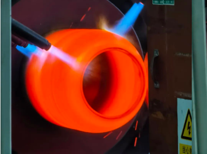 4分鐘(zhong)高(gao)溫加熱、5分鐘(zhong)高(gao)速旋(xuan)壓,很(hen)快(kuai),一個正常口徑的特種鋼(gang)管(guan),變成了(le)可承受高(gao)壓的球面封頭。