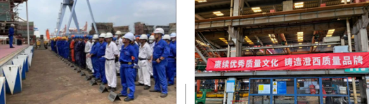 中船澄西組織各部門、車間舉行質量誓師大會、質量承諾簽名等活動,進一步強化全員“質量至上”意識,將質量責任落在筆下、放到心中。質量部牽頭開展工程承包商質量管理體系運行“回頭看”專項檢查活動,通過“把脈體檢”,促進施工“主力軍”不斷規范質量管理工作,以管理能力提升促進質量工作提高。
