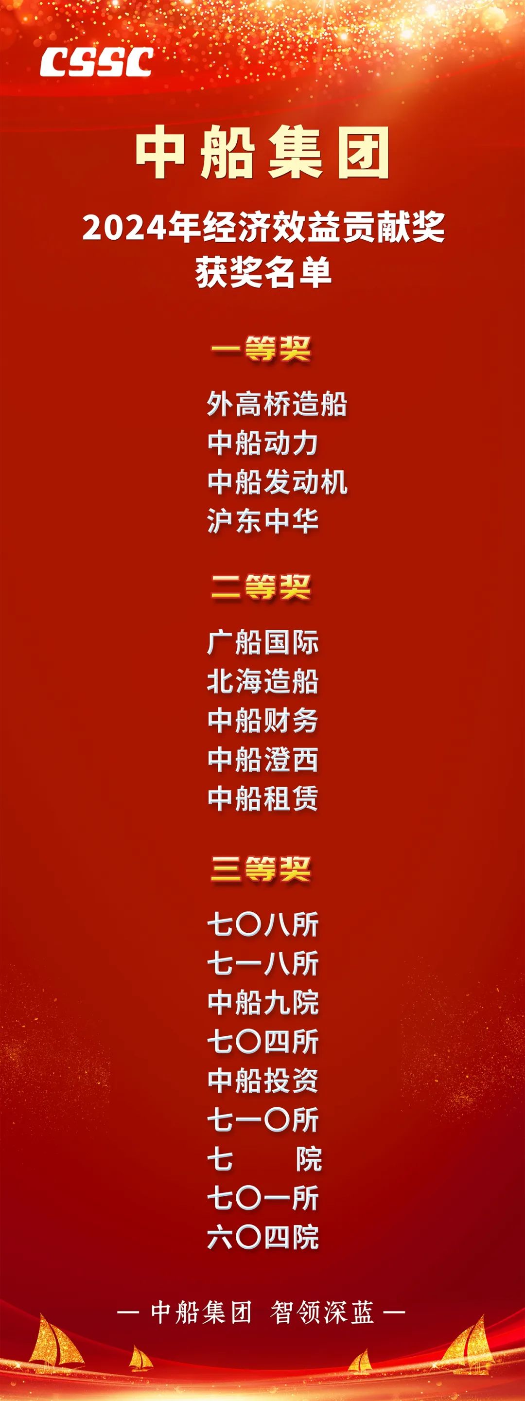 2024年,面對復雜多(duo)變的外(wai)部(bu)環(huan)境和不(bu)確定因素(su),中國船(chuan)舶集團(tuan)有限公司各二(er)級管理(li)單(dan)位著力拓市場、強管理(li)、抓(zhua)改革、增效(xiao)益(yi),實現了量的合理(li)增長、質的有效(xiao)提升,整體經濟效(xiao)益(yi)再創(chuang)新高。為樹立(li)典范,表彰先(xian)進,經中船(chuan)集團(tuan)黨組(zu)研究,決定授予外(wai)高橋造船(chuan)等18家(jia)單(dan)位2024年中船(chuan)集團(tuan)經濟效(xiao)益(yi)貢獻獎。