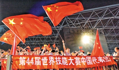 圖為日前在阿拉伯聯合酋長國舉行的第44屆世界技能大賽開幕式上,人們揮舞著中國國旗歡迎中國代表團入場。