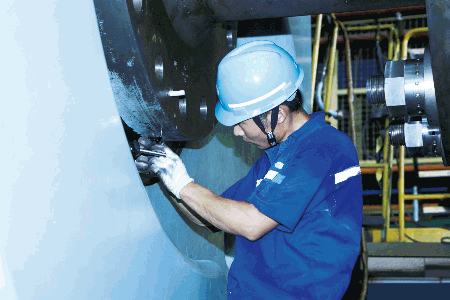 上海船院質量檢測工程師正在檢測扭曲舵套筒。該扭曲舵由上海船院研發設計,將用于黃埔文沖在建的2700TEU集裝箱船。