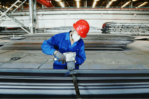 物資公司下屬鞍山公司預處理車間現場,中午最高可達40°C,工作人員正在進行型材預處理作業,保質保量完成物資供應。
