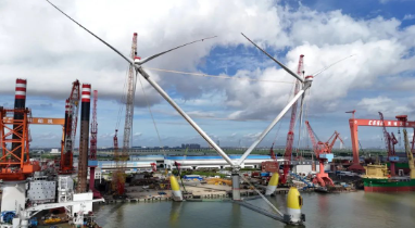 7月3日,由中國船舶集團旗下黃埔文沖建造的漂浮式風電平臺“明陽天成號”(OceanX)完成吊裝。