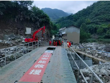四川省公(gong)路交通(tong)應急裝備(bei)(bei)(bei)物資(zi)儲備(bei)(bei)(bei)中(zhong)心在(zai)現(xian)場道(dao)路損毀處架設了(le)一座21米應急機械化橋,有效保(bao)障救援(yuan)人員(yuan)和(he)重型設備(bei)(bei)(bei)通(tong)行。架設前,中(zhong)船應急和(he)四川省公(gong)路交通(tong)應急裝備(bei)(bei)(bei)物資(zi)儲備(bei)(bei)(bei)中(zhong)心進行了(le)工作(zuo)對接并提供技術支持。
