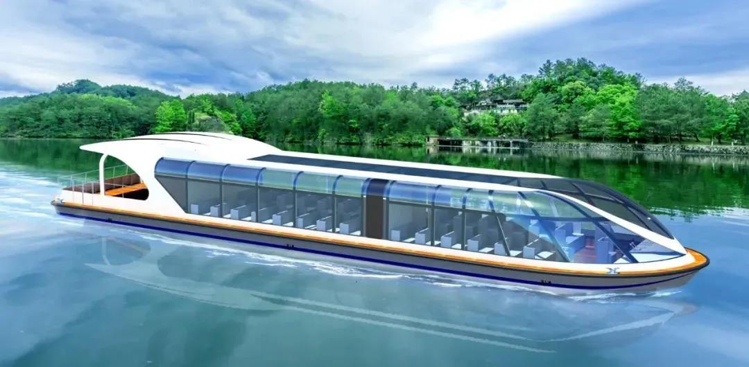 △ 新疆喀納斯新能源游船總長(chang)19.7米(mi),船寬4.5米(mi),型深(shen)1.6米(mi),最(zui)大航(hang)速18km/h,乘客60人。