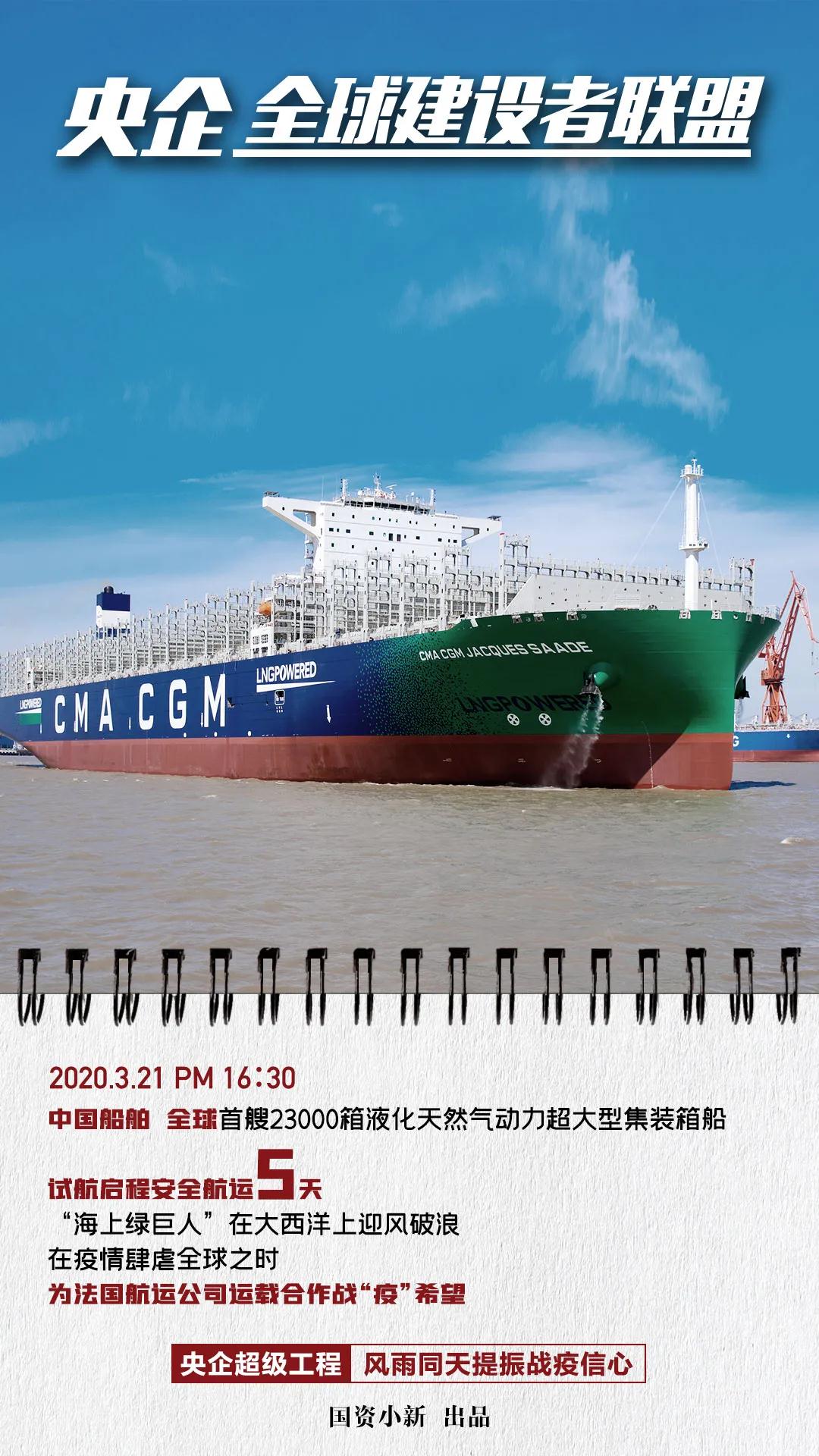 ????今天,國資小新發布圖文(wen)消息(xi)《央(yang)企全(quan)(quan)球建設者聯盟:風雨同(tong)天提(ti)(ti)振國際合(he)作戰疫信心(xin)!》。開(kai)篇(pian)提(ti)(ti)到(dao)中國船舶(bo)集團所屬(shu)滬東(dong)中華建造的全(quan)(quan)球首(shou)艘23000箱液化天然氣(qi)(LNG)動力集裝箱船開(kai)啟常規(gui)試航之旅,在疫情肆虐全(quan)(quan)球之時(shi),為法國航運(yun)公司運(yun)載合(he)作戰“疫”希望。