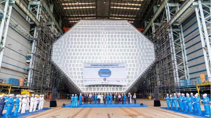 VLEC建造團隊在船東、配套廠商和船級社等各方密切配合下,共同克服新冠肺炎疫情等不利因素,攻克B型液貨艙核心關鍵技術難點,注重項目管理導向、革新工藝工法、鎳鋼焊接程序、薄板變形控制和優化建造流程。從2019年12月底合同簽約到今天首制船的完工交付,總建造周期24個月,碼頭舾裝周期4個月,均開創了江南造船大型液化氣船首制船最短周期紀錄,實現了復雜船型節拍化建造。