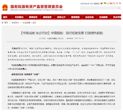 【編者(zhe)(zhe)按】6月13日,第32個(ge)全國(guo)節能(neng)(neng)宣傳周開啟。節能(neng)(neng)是生態文明建設的(de)重要內容,是推(tui)進(jin)(jin)碳達(da)峰碳中和、促(cu)進(jin)(jin)高質量(liang)發展的(de)重要支撐。中央(yang)(yang)企業(ye)努(nu)力爭當能(neng)(neng)源清潔(jie)低碳轉型的(de)推(tui)動(dong)者(zhe)(zhe)、先行者(zhe)(zhe)、引領(ling)者(zhe)(zhe),“十三(san)五(wu)”期間,央(yang)(yang)企能(neng)(neng)源消費總(zong)量(liang)、碳排放總(zong)量(liang)得(de)到有效(xiao)控制,能(neng)(neng)源消耗強度、碳排放強度、主(zhu)要污染(ran)物排放總(zong)量(liang)持續大幅下降(jiang)。6月16日,國(guo)資委網站(zhan)在“節能(neng)(neng)減碳 央(yang)(yang)企行動(dong)”系列(lie)報(bao)道中,展示中國(guo)船舶集團有限公司促(cu)進(jin)(jin)社會綠色低碳的(de)生動(dong)實踐。