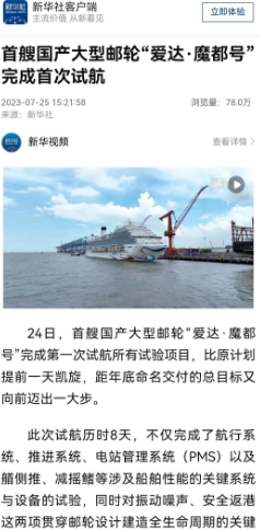 7月24日晚,首艘國產大型郵輪“愛(ai)達·魔都號”完成第(di)一次試航所有試驗(yan)項目比原計劃提(ti)前一天凱旋,人民日報、新華社、中(zhong)央電視臺等中(zhong)央主流(liu)媒(mei)體進行了報道(dao)。