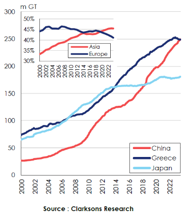截至8月12日,我國船東所持有的船隊規模已經達到2.492億總噸,市場份額占比為15.9%(中國船東的船隊價值約為1800億美元),略高于希臘船東的2.490億總噸,市場份額占比15.8%(希臘船東的船隊價值約為1630億美元)。