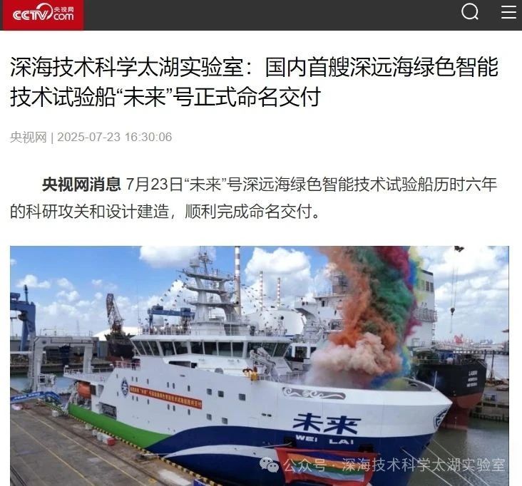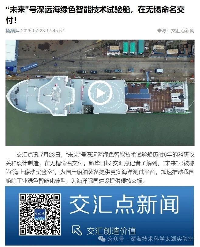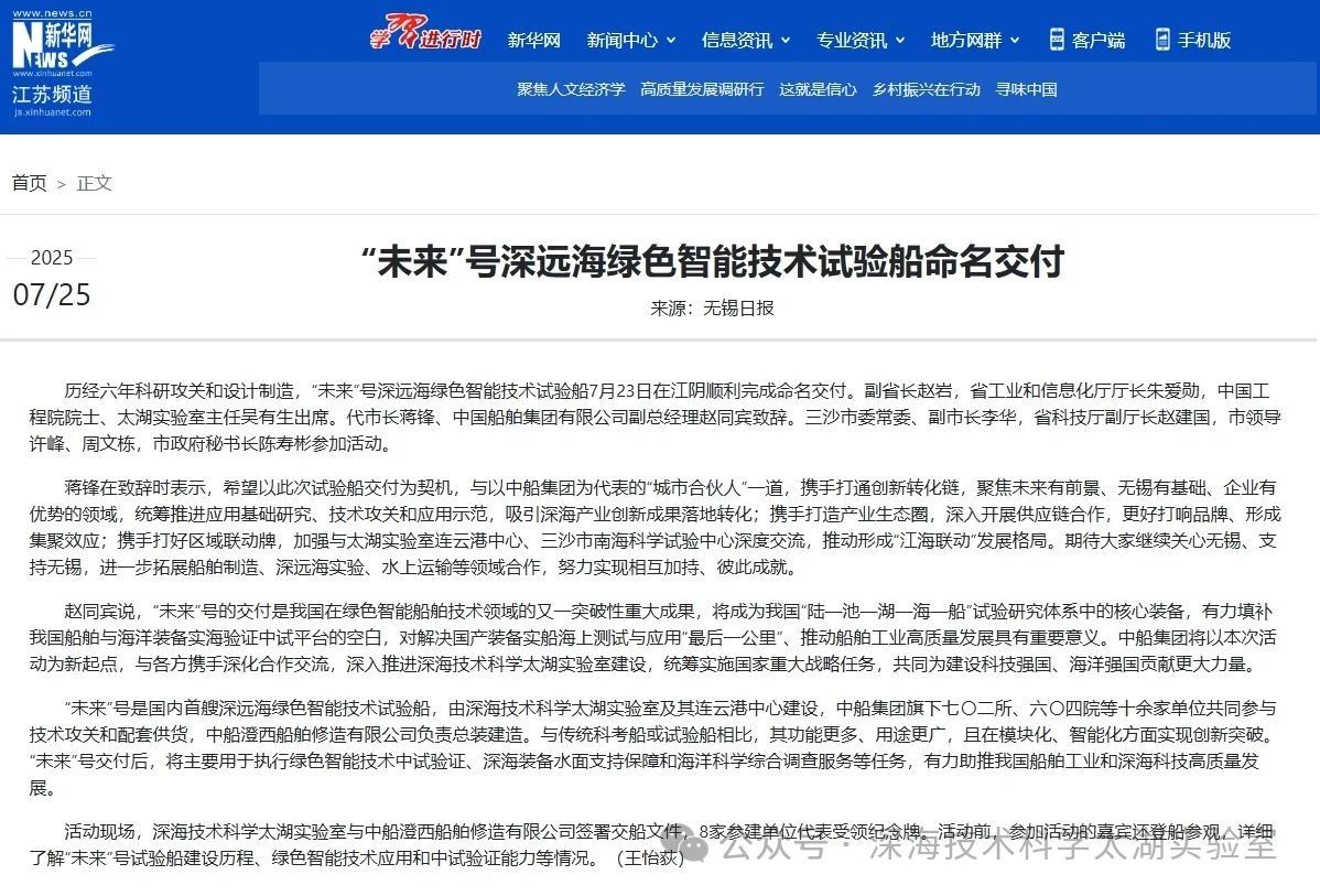 7月23日,由深海技術科學太湖實驗室歷時六年科研攻關和設計建造的“未來”號正式命名交付。中船集團旗下七〇二所、上船院、七〇四所、七一一所、七一二所等十余家單位共同參與技術攻關和配套供貨,中船澄西負責總裝建造人民日報、新華社、央視新聞、科技日報等主流媒體共同聚焦這一“國之重器”。