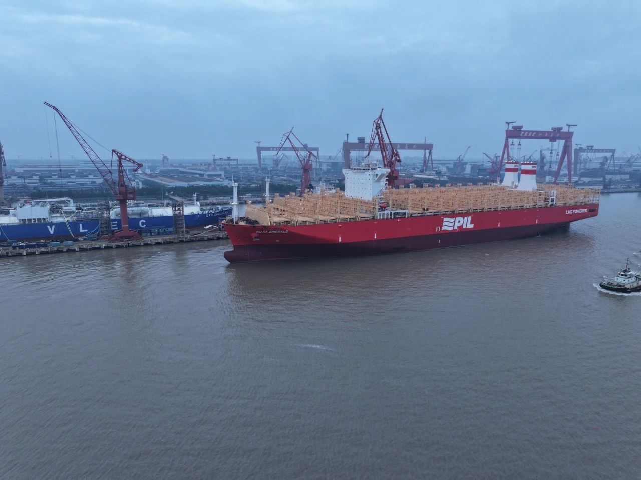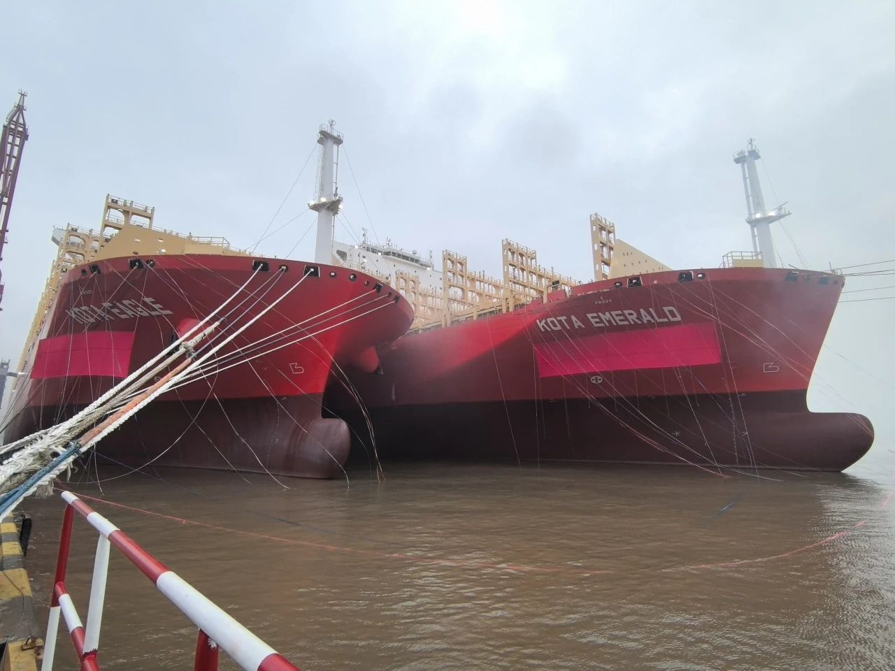10月15日(ri),中國船舶集團旗下江南造船聯(lian)合中船貿易為太平船務建(jian)造的(de)14000TEU液化天(tian)然(ran)氣(LNG)雙燃料(liao)動力系列集裝箱船首制船“KOTA EAGLE(鷹城)”號(hao)和(he)2號(hao)船“KOTA EMERALD(翠城)”號(hao)同日(ri)命(ming)名,其(qi)中“KOTA EAGLE(鷹城)”號(hao)于當日(ri)簽字交付。
