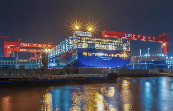 11月20日(ri),由中(zhong)國(guo)船(chuan)舶集(ji)團旗下滬東中(zhong)華(hua)建造的全球(qiu)最(zui)大24000TEU級液化(hua)天然氣(LNG)雙(shuang)燃料動力超大型集(ji)裝箱船(chuan)首(shou)制船(chuan),提前10天順利(li)出塢。