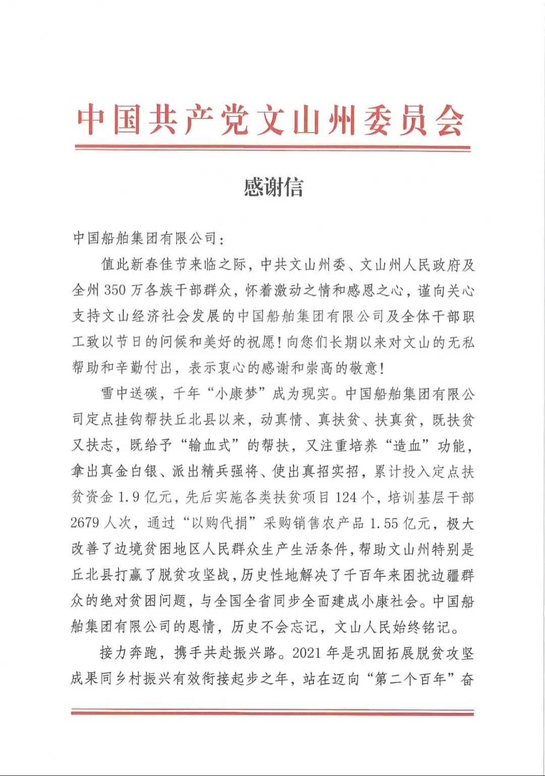 春節前夕,中國船舶集團陸續收到云南省委省政府、文山州委州政府、鶴慶縣委縣政府、勐臘縣政府發來的感謝信,對集團公司長期以來給予鶴慶縣、勐臘縣、丘北縣的傾力幫扶表示衷心感謝和崇高敬意。